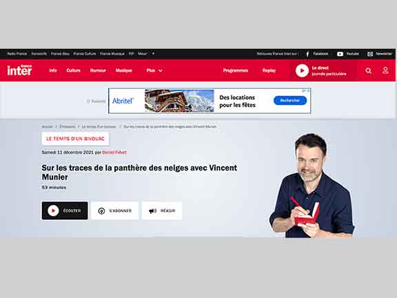 Retrouvez l’entretien entre Vincent Munier et Daniel Fiévet autour du projet de la Panthère des neiges, dans l’excellent podcast Le temps d’un bivouac sur France Inter