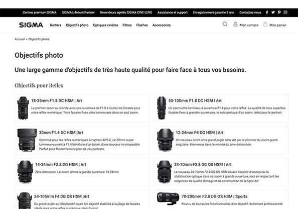 Rendez-vous sur le site SIGMA France pour découvrir notre gamme complète de focales fixes et zooms, du grand-angle au téléobjectif, pour votre hybride ou votre Reflex.